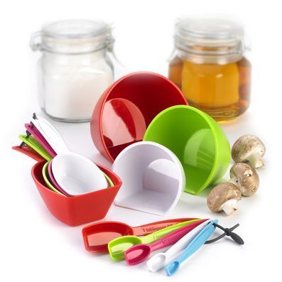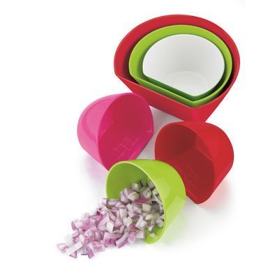 Zestaw 4 kolorowych misek, które mogą służyć jako miski do przygotowywania potraw, jako miarki oraz naczynia do przechowywania. Każda z nich ma pojemność 2,5 szklanki.