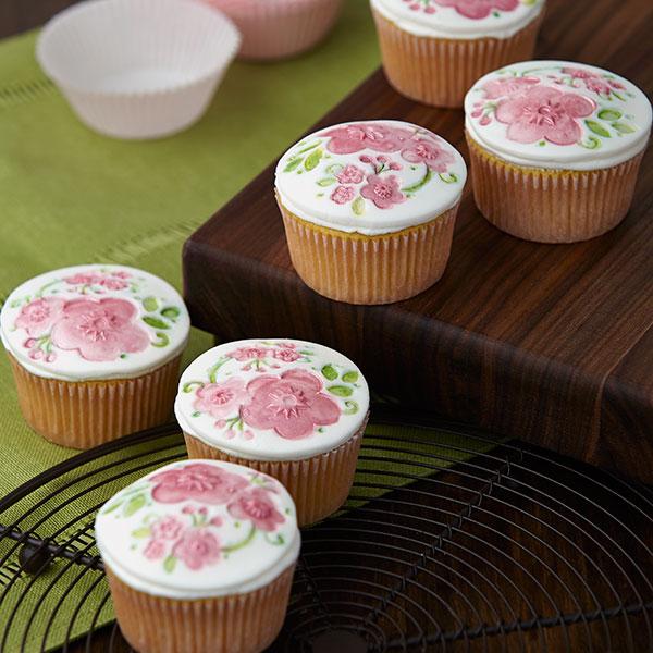 Jak to robić? Przy pomocy wykrawaczki wycinasz okrąg z rozwałkowanego fondantu, a korzystając z wybranych stempelków (stempelki można delikatnie oprósz skrobią ziemniaczaną lub kukurydzianą albo cukrem pudrem) - wycinasz wzór. Gotową ozdobę, najlepiej przy pomocy szpatułki przenosisz na cupcake, który posmarowany jest kremem maślanym.