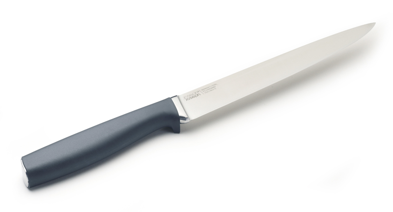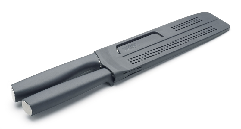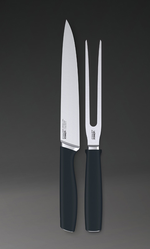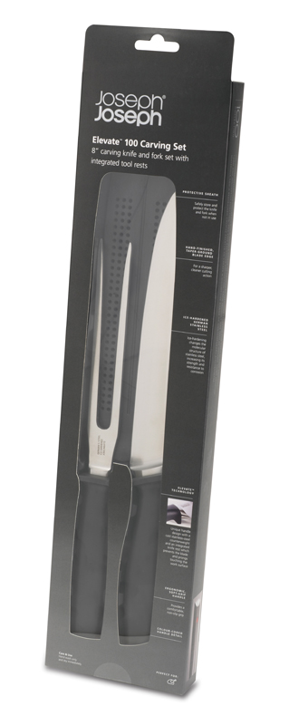Zestaw złożony z noża do mięs i widelca, idealny do krojenia pieczeni, schabów itp. Ostrze noża i szpikulce widelca wykonane z niemieckiej stali nierdzewnej z dodatkiem wanadu, utwardzane na zimno. Rączki z tworzywa sztucznego przyjemnego w dotyku profilowane tak, aby ostrza były ponad powierzchnią stołu. Dołączona podwójna osłonka na ostrza – zestaw przechowywany w jednym miejscu.