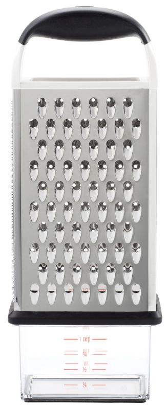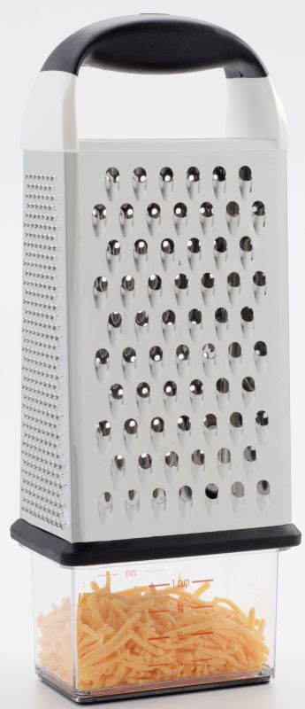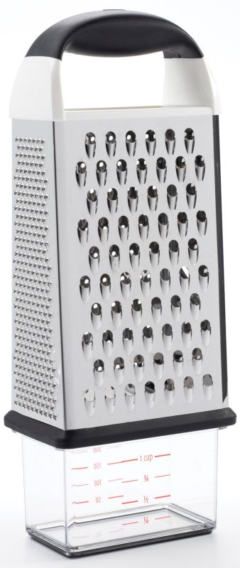Dołączony pojemnik jest dopasowany do tarki. Ma dołączoną pokrywkę oraz dno pokryte antypoślizgowym materiałem. Pojemnik można włożyć do dna tarki i ścierać bezpośrednio do niego. Na pojemniku znajduje się podziałka.
