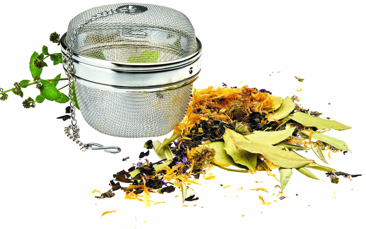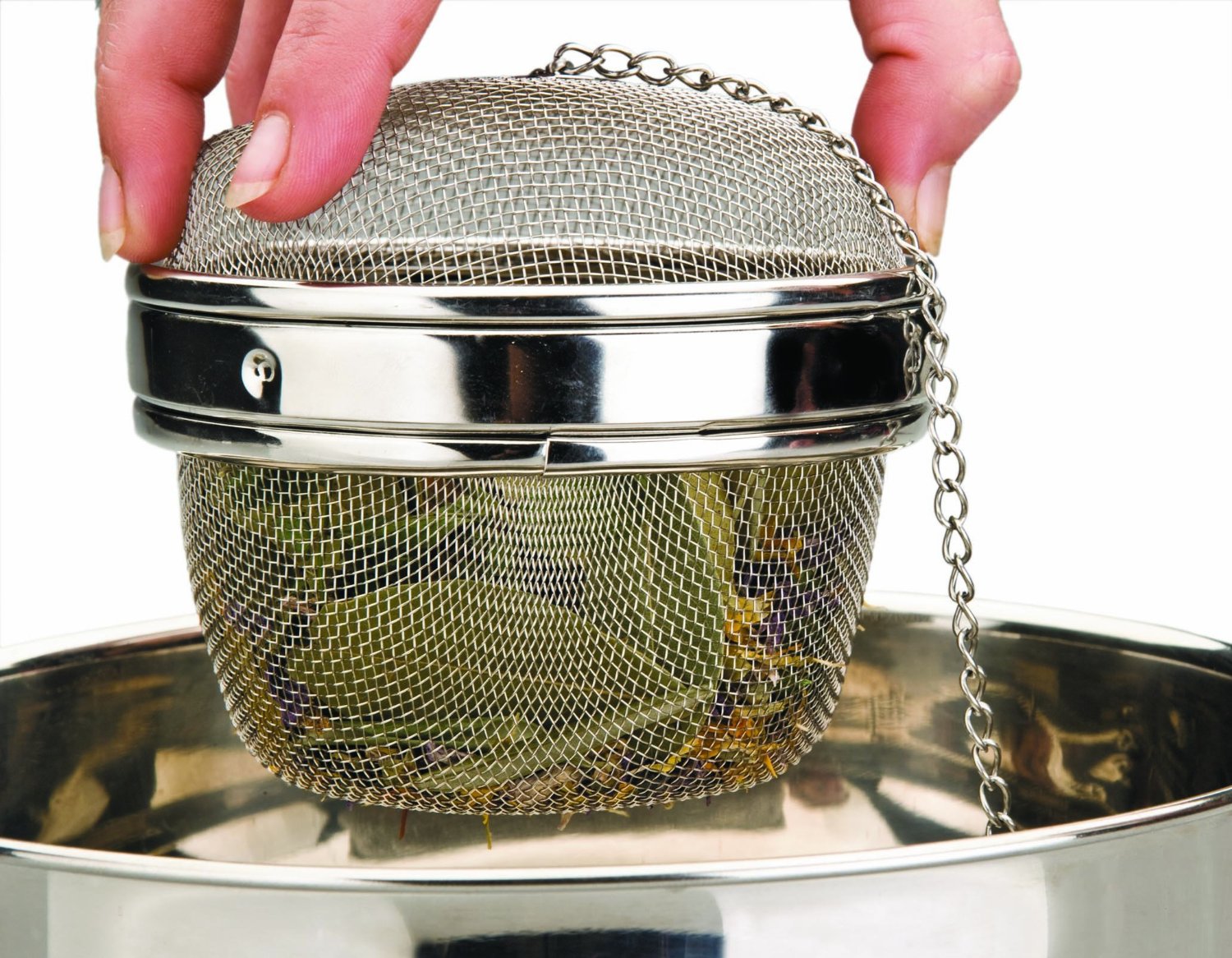 Koszyczek ma praktyczne zamknięcie bagnetowe oraz łańcuszek z haczykiem, który można zawiesić na uchu lub rancie garnka, by wyciągnąć koszyczek jednym ruchem.