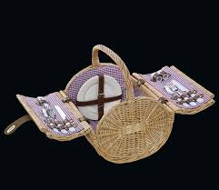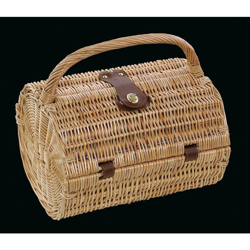 Ręcznie wykonany wiklinowy kosz piknikowy z wyposażeniem na piknik dla dwóch osób.