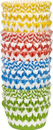Komplet 300 ozdobnych papilotek do muffinów i babeczek. Ten duży zestaw składa się z papilotek w letnich kolorach: żółtym zielonym, niebieskim i czerwonym z paseczkami.