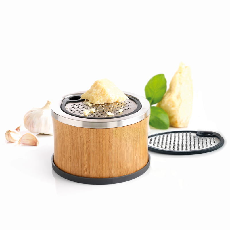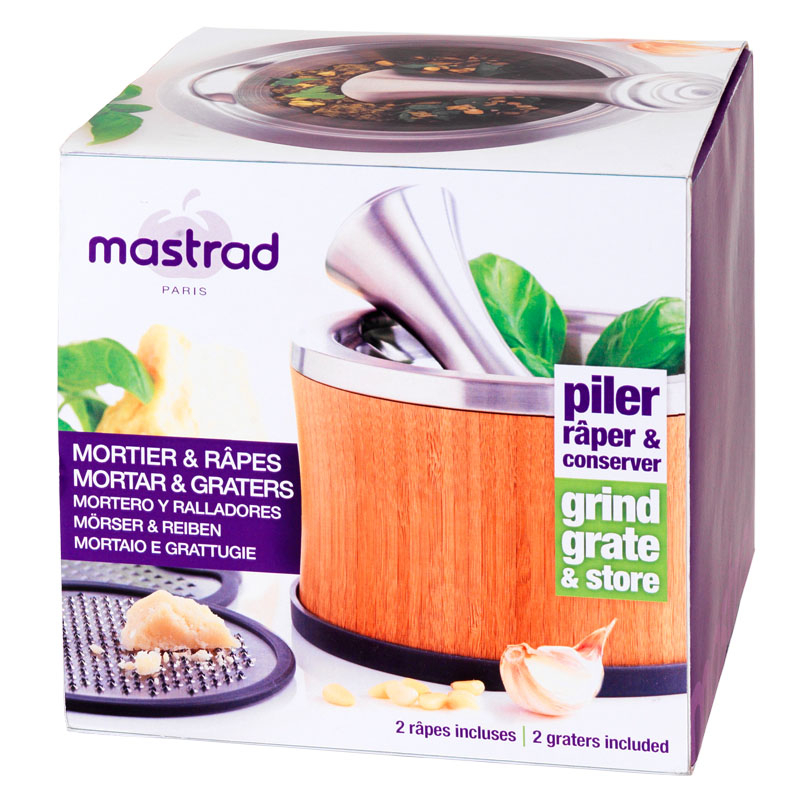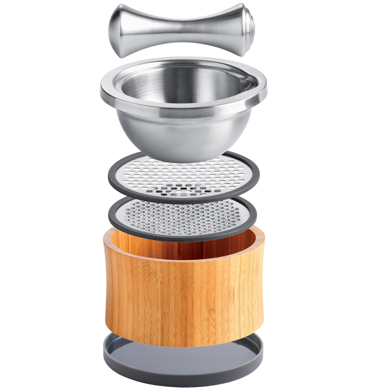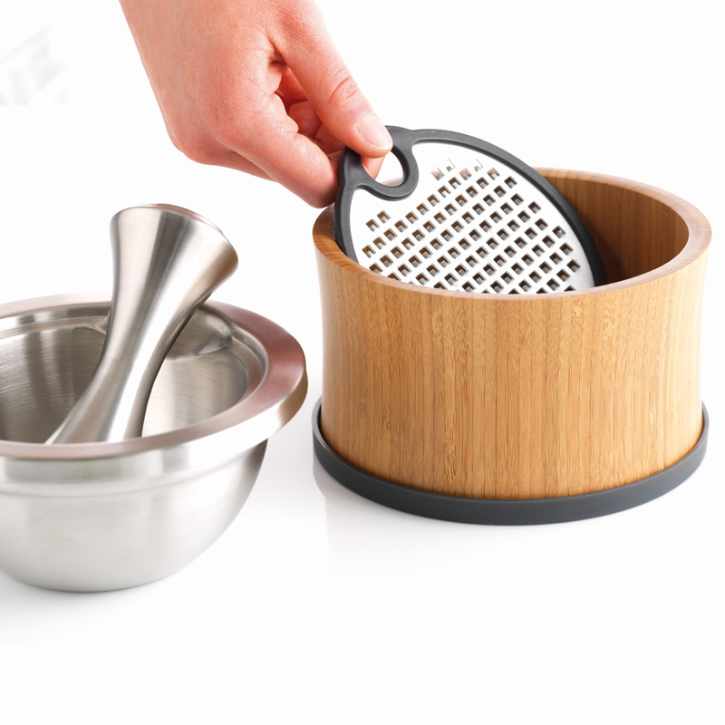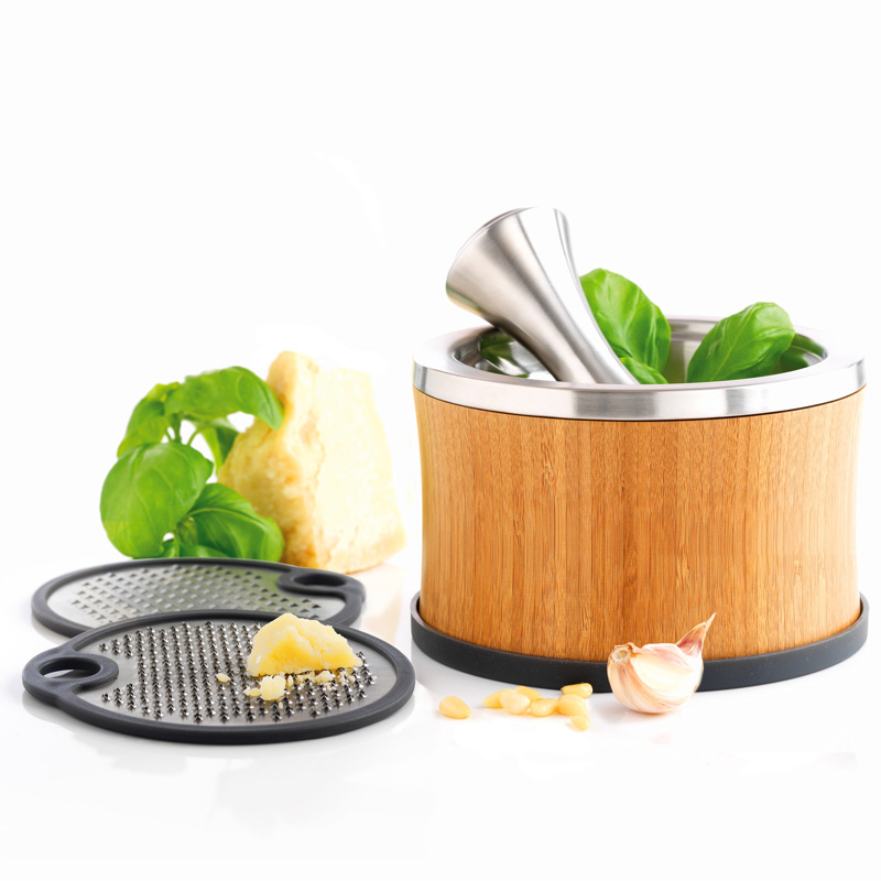 Połączenie drewna bambusowego i stali nierdzewnej tworzy elegancki zestaw, w którym można przygotować sosy, zetrzeć warzywa, owoce i sery, a także rozgnieść przyprawy.