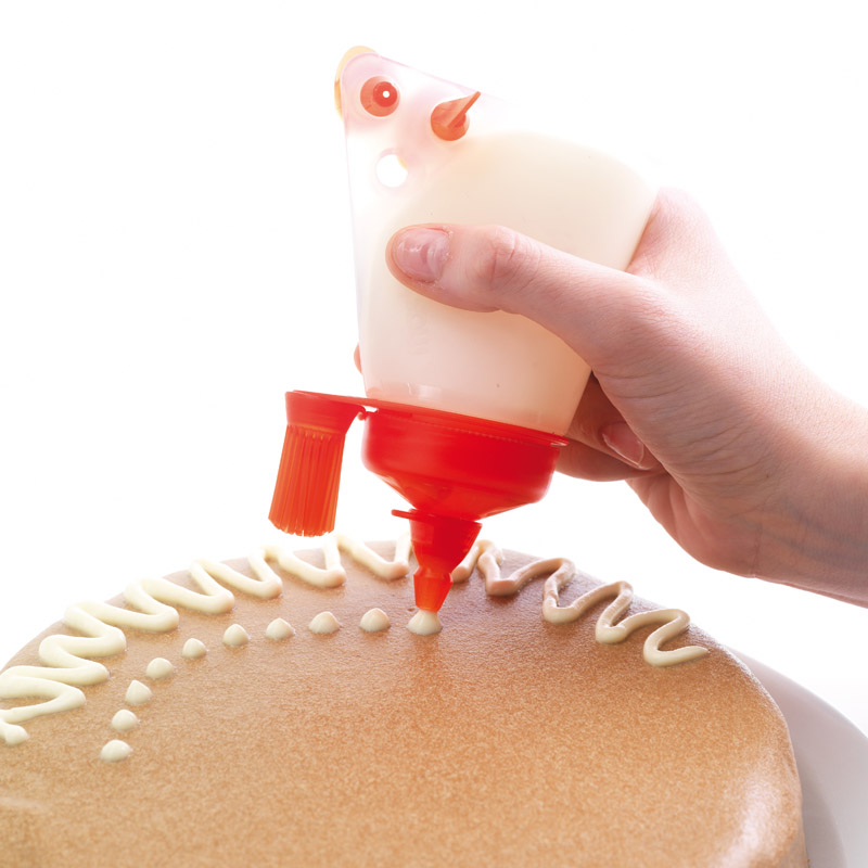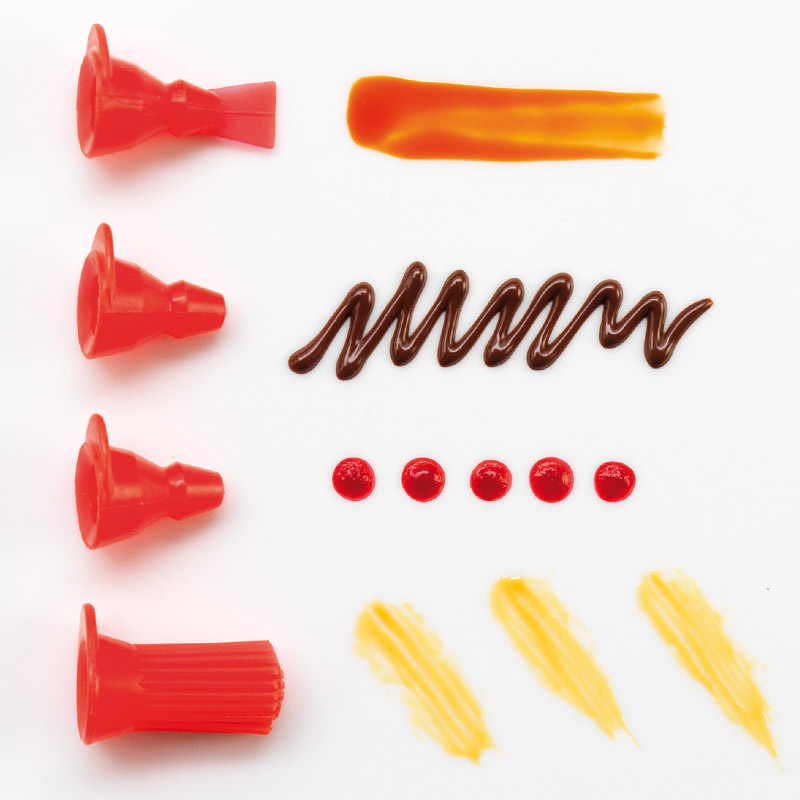 Końcówki pozwalają tworzyć cienkie i grube linie lub kropki, szerokie płaskie linie, a końcówka z pędzelkiem na końcu można użyć także do smarowania jajkiem ciasta.