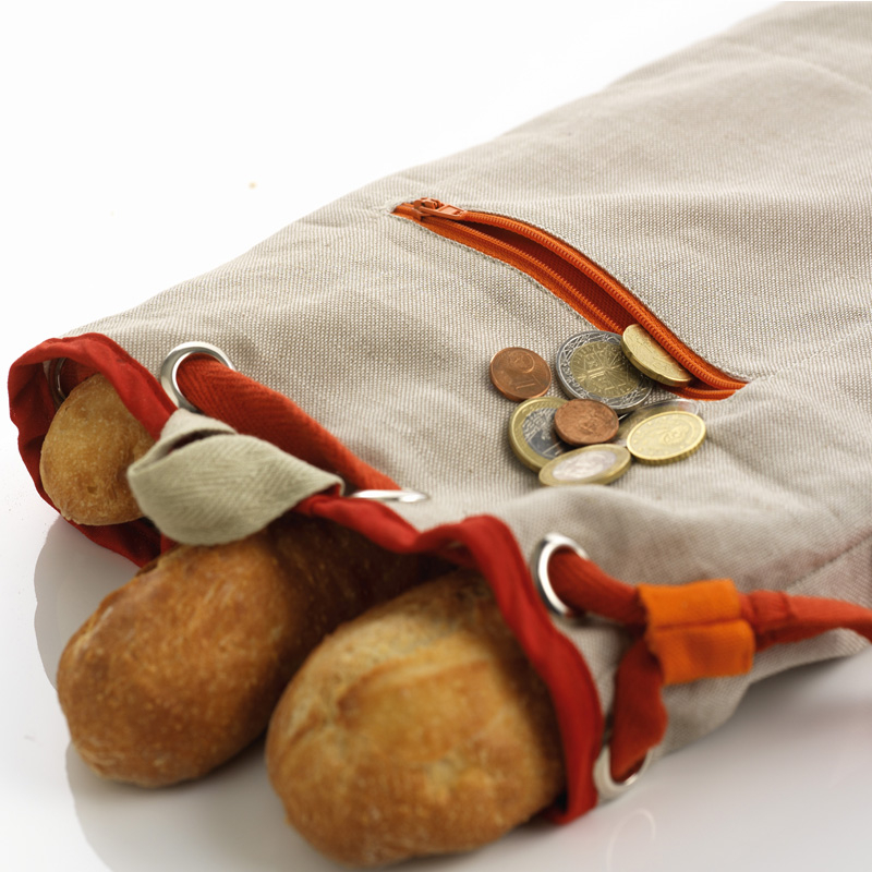 W torbie są specjalne kieszenie oraz jedna kieszonka zapinana na zamek. Do kieszeni można włożyć chleb, bagietki lub croissanty, a nawet poranną gazetę. W zapinanej kieszonce można trzymać monety.