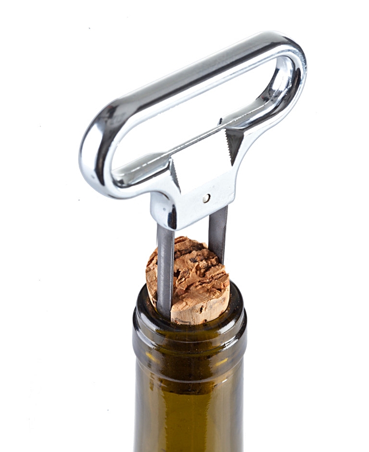 Zaczynając od dłuższego ostrza, należy je włożyć między korek a wewnętrzną stronę szyjki i delikatnie skręcając, popychać w dół. Na koniec wystarczy mocno pociągnąć i wyjąć korek.