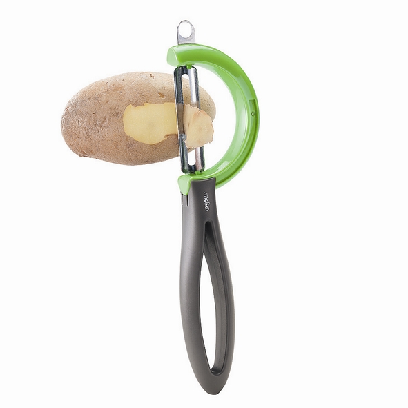 Ostrze zostało wykonane ze stali nierdzewnej, zaś rączka i obudowa z tworzyw sztucznych wysokiej jakości. Pionowe ostrze ma specjalne oczko do usuwania niechcianych miejsc z ziemniaków. Obrotowe ostrze pozwala obierać warzywa w obu kierunkach, więc nadaje się również dla osób leworęcznych.
