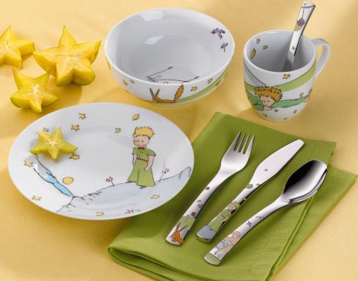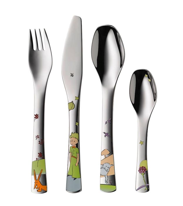Komplet sztućców dla dzieci ozdobiony tak lubianymi nie tylko przez najmłodszych postaciami z książki "Mały książę" Antoine’a de Saint-Exupéry’ego, zilustrowanej przez autora.