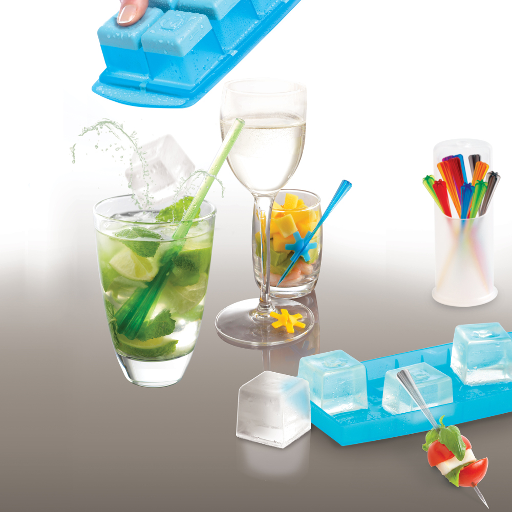 Foremka do dużych kostek lodu wykonana została z tworzywa sztucznego i silikonu w kolorze niebieskim. Dzięki silikonowej foremce można bezproblemowo wyjąć kostki lodu a pokrywka zapobiega przenikaniu zapachów z zamrażalnika. Kostki lodu perfekcyjnie schłodzą napój.