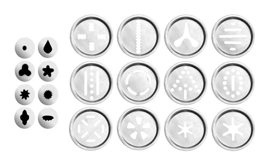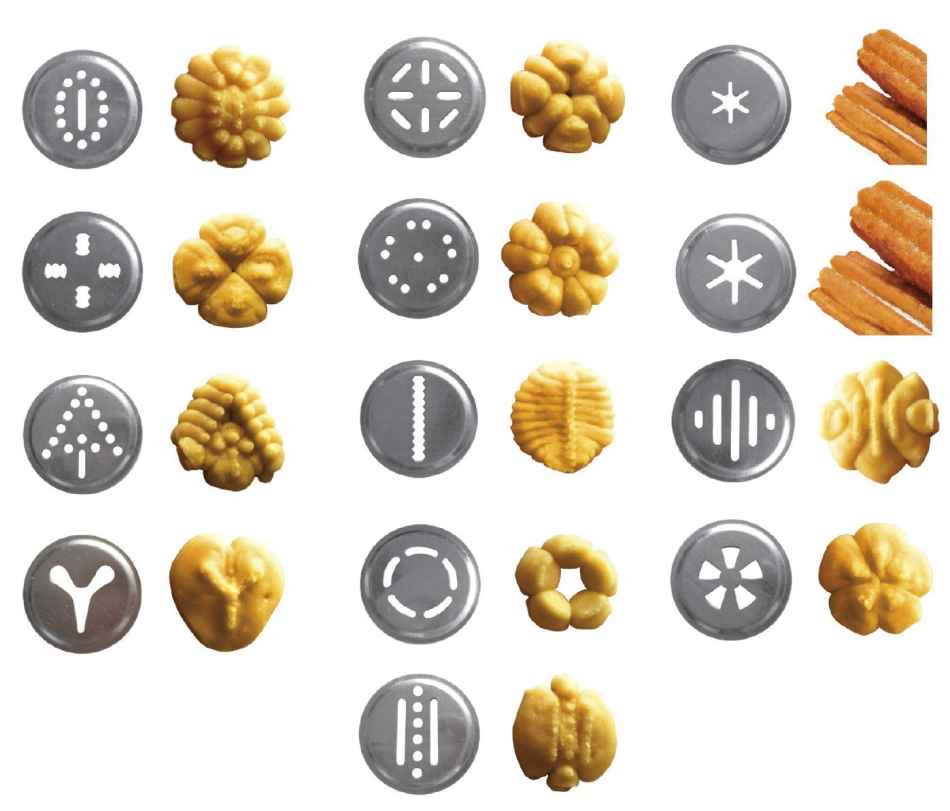 - 13 dysków z otworami w różnych kształtach, umożliwiającymi wyciskanie ciasteczek w 13 kształtach