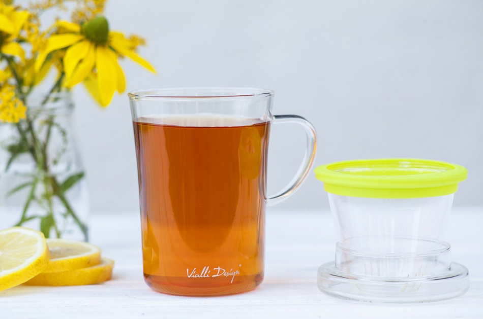 Piękna i nowoczesna szklanka z zaparzaczem do herbaty marki Vialli Design.