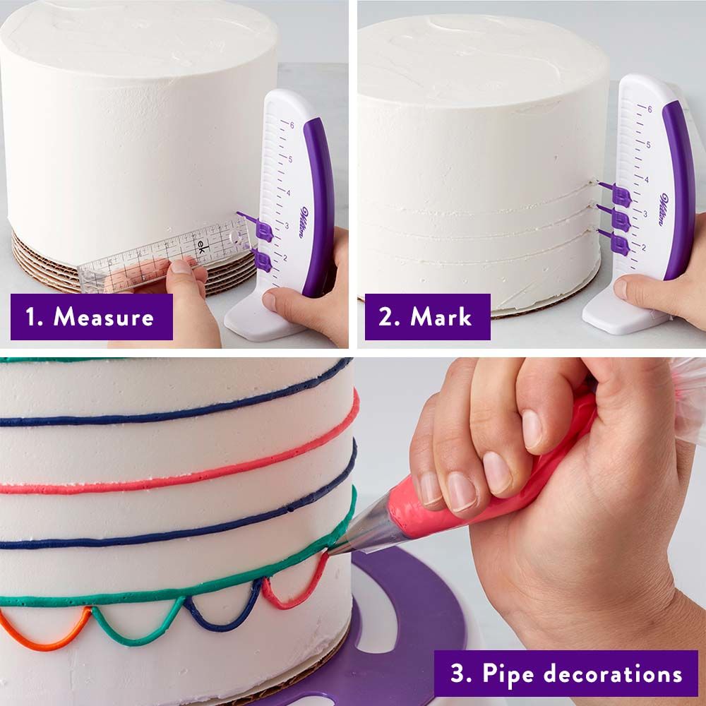 Dzięki trzem ostro zakończonym znacznikom, poruszającym się wzdłuż podziałki zakończonej wygodnym uchwytem, wyznaczysz dokładnie wysokość szlaczków i obrzeży z kremu lub umiejscowienie rozet czy kwiatów. A wszystko to przy użyciu jednej ręki.