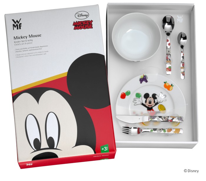 Sześcioelementowy zestaw obiadowy dla dzieci ozdobiony tak lubianą od dziesięcioleci przez najmłodszych postacią z kreskówki "Myszka Mki".