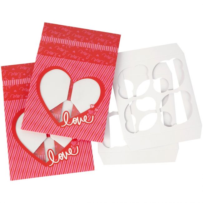 Komplet dwóch kartonowych pudełek, każde na 4 muffiny, z walentynkowymi dekoracjami i napisem "Love". Doskonałe na słodki podarunek dla ukochanej osoby.