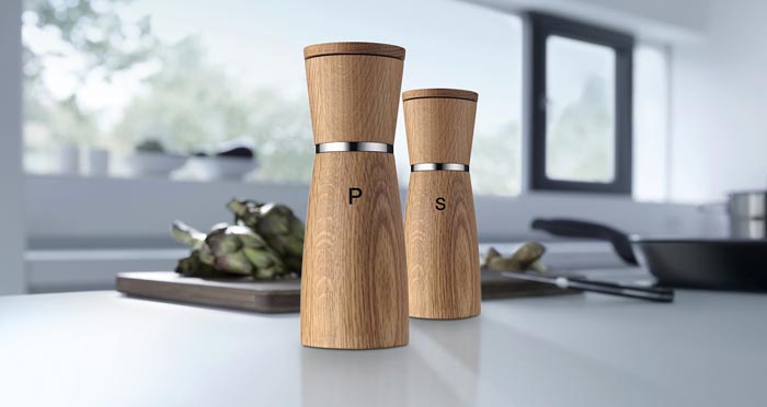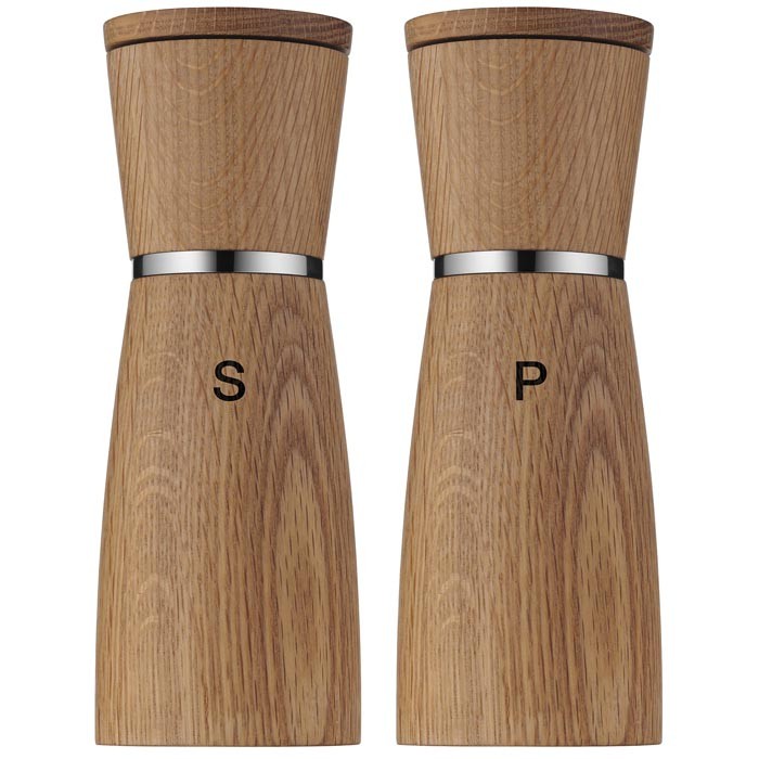 Zestaw 2 młynków drewnianych do soli i pieprzu. Młynki mają elegancki, minimalistyczny kształt - bardzo dobrze prezentują się w nowoczesnej kuchni czy jadalni.Wyposażone są w ceramiczny mechanizm mielący, na który producent daje 10 lat gwarancji.