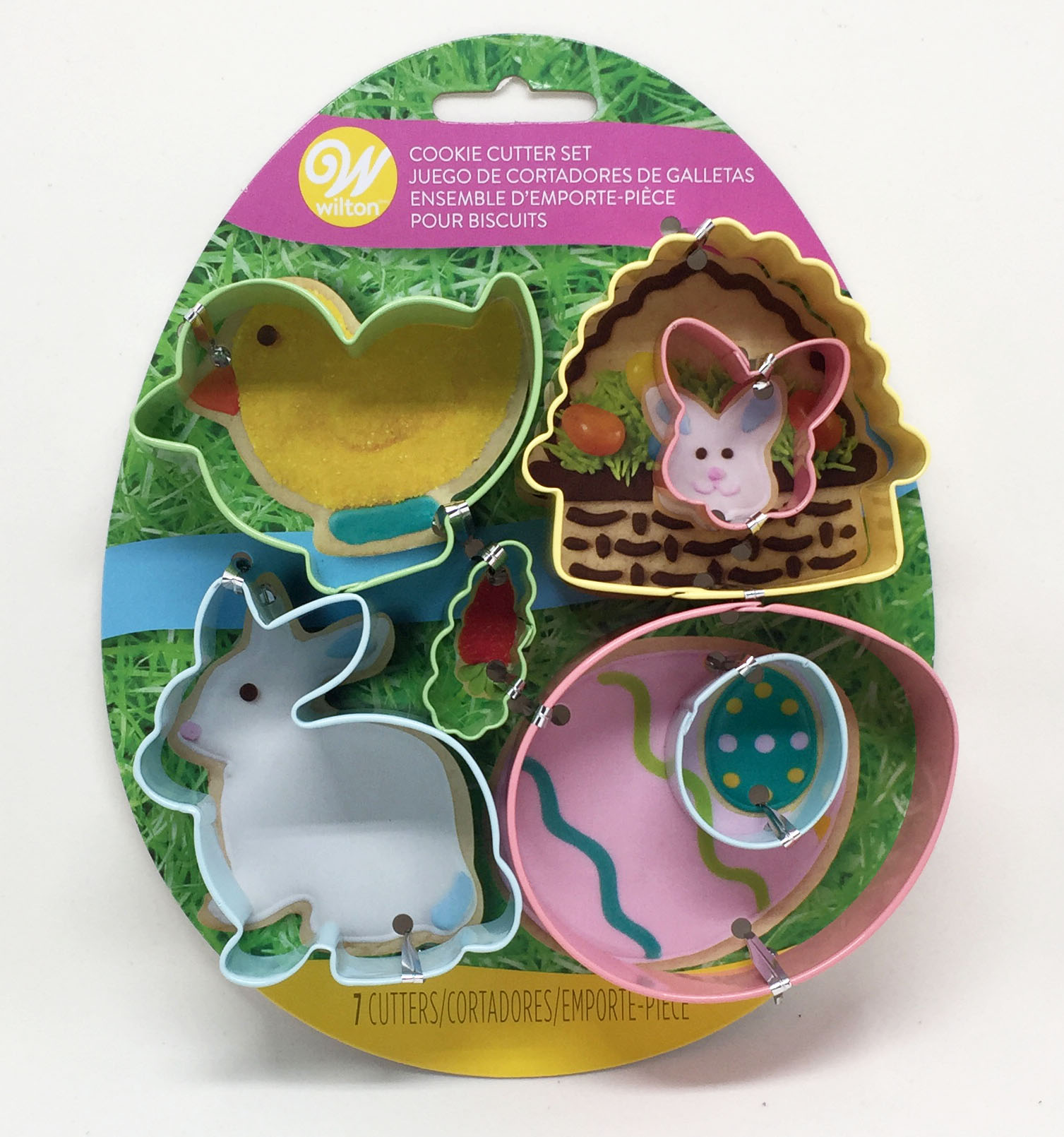 Zestaw siedmiu różnokolorowych metalowych foremek w wielkanocnych kształtach: koszyczka, zająca, kurczaka, małej głowy zajączka, marchewki oraz dużego i małego jajka.