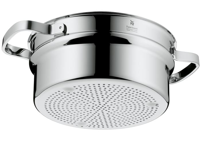 Parownik - wkład do gotowania na parze, wykonany z polerowanej stali nierdzewnej odpornej na uszkodzenia i zadrapania. Wyposażony jest w nienagrzewające się rączki i wypustki na dnie.