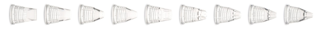 W zestawie znajduje się 9 tylek z tworzywa sztucznego o różnych końcówkach (shell, star, large star, plain i large plain) do dekorowania wypieków.