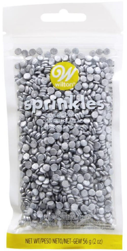 Posypka cukrowa w kształcie srebrnych małych confetti.