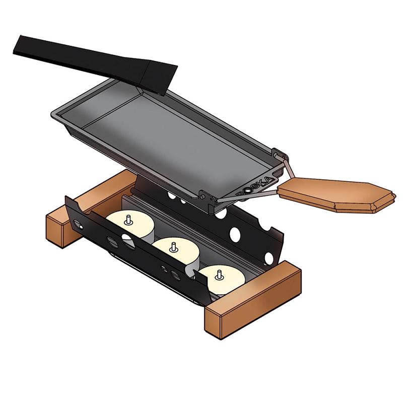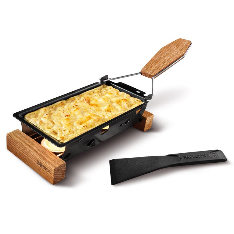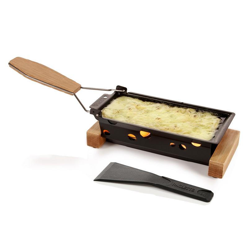 Zestaw do przygotowania raclette, idealny na długie chłodne wieczory. W skład zestawu wchodzi metalowa patelnia z uchwytem, łopatki do zdejmowania sera oraz 3 podgrzewaczy.