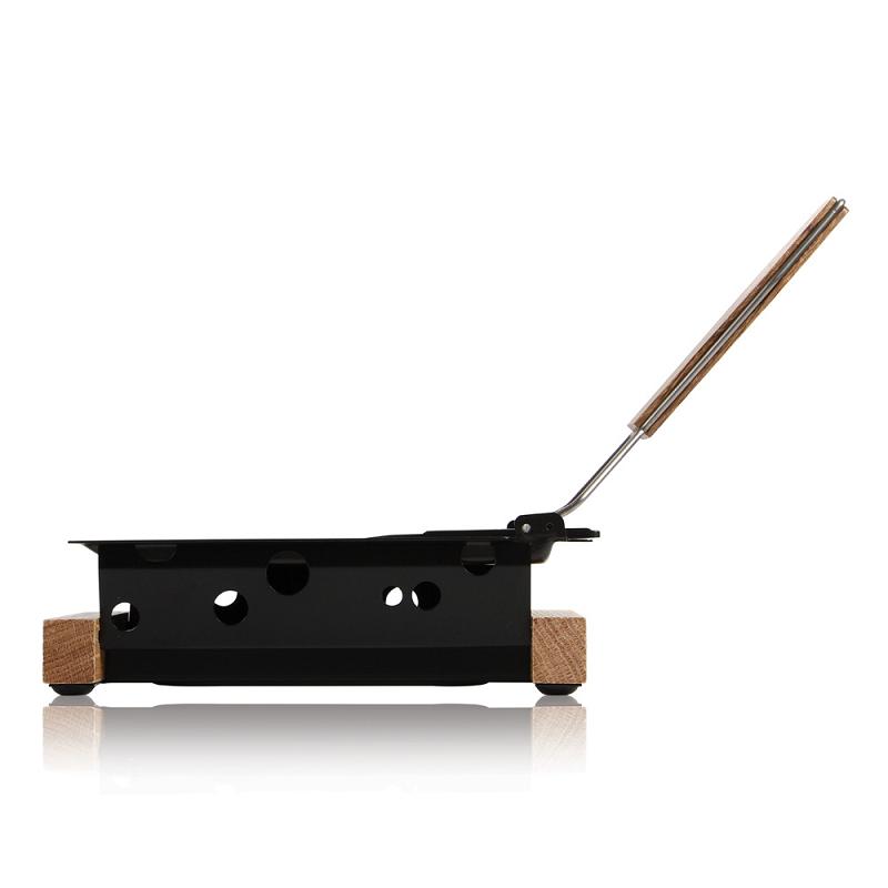 Po rozłożeniu metalowych boków podstawy, delikatnie je rozchylamy przytrzymując a następnie wsuwamy prostokątną patelenkę. Patelni nie należy zdejmować w trakcie użytkowania a zestawu podnosić. Roztopiony ser przekładamy łopatką delikatnie zsuwając. W trakcie użytkowania należy pamiętać, że elementy nagrzewają się a pod spodem płonie ogień.