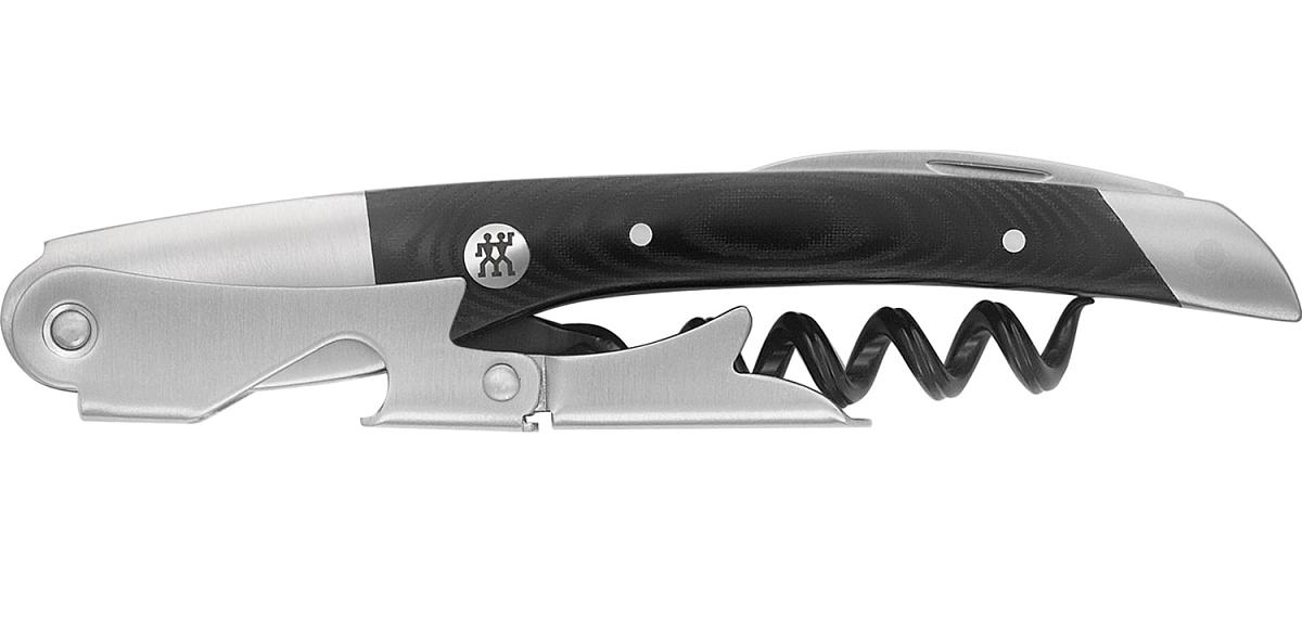 Elegancki i wygodny korkociąg idealnie nadaje się na prezent. Wykonany jest z satynowej stali w połączeniu z czarnym drewnem. Posiada ostrze do rozrywania folii oraz element, który umożliwia otwieranie butelki za pomocą dźwigni. Zapakowany jest w eleganckie pudełko.