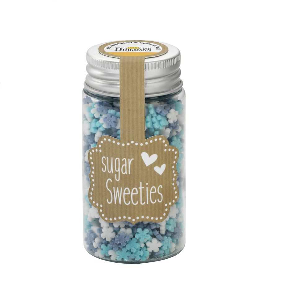 Piękny oraz słodki - cukier ozdobny w kształcie płatków śniegu w kolorach białym + błękitnym + niebieskim firmy Birkmann.