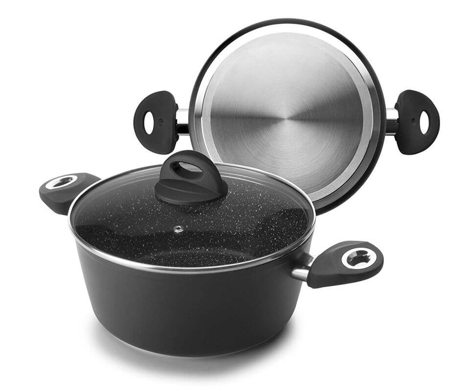 Garnek wysoki dwuwarstwowy złożony z trwałej i odpornej powłoki antyadhezyjnej o wyglądzie struktury kamienia.