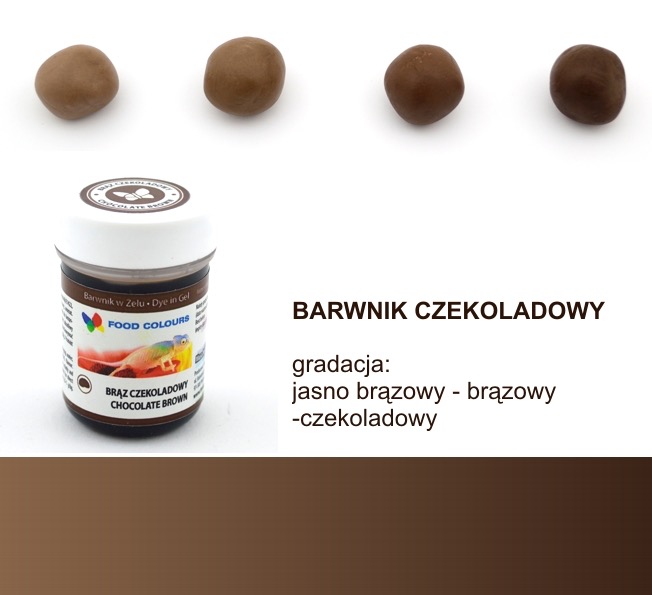 Składniki: glicerol E422, syrop glukozowy, woda, barwniki: Tlenek Żelaza E172, aromat, substancja zagęszczająca: modyfikowana skrobia kukurydziana E1422, substancje konserwujące: sorbinian potasu E202, regulator kwasowości: kwas cytrynowy E330. Barwnik do celów spożywczych, nie przeznaczony do bezpośredniego spożycia. Przechowywać w suchym i chłodnym miejscu. Warunki użycia - Stosowanie - kategoria 05.2 Pozostałe wyroby cukiernicze - quantum satis, kategoria 05.4 Dekoracje, powłoki - quantum satis. Produkt bezglutenowy.