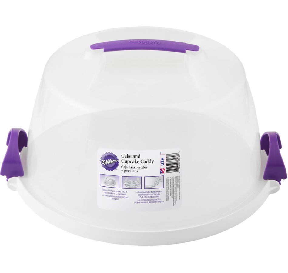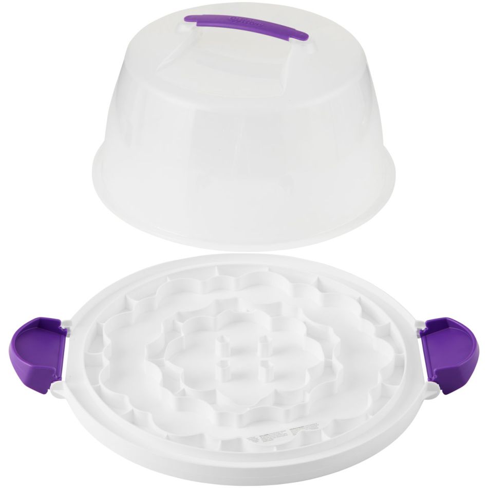Pojemnik do transportu tortów Wilton składa się z dwóch elementów: eleganckiej patery mogącej pomieścić ciasto o średnicy do 25cm, i zatrzaskowej, przeźroczystej pokrywy o wysokości 15 centymetrów, która ochroni górę i boki ciasta przed uszkodzeniem.
