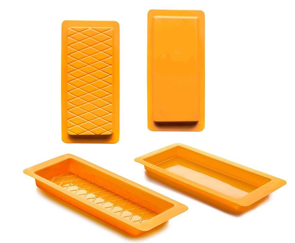 Silikonowe formy z wgłębieniem do wyrobu domowej czekolady i bloku orzechowego.