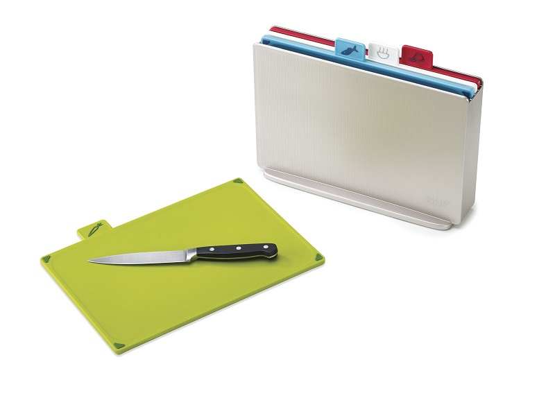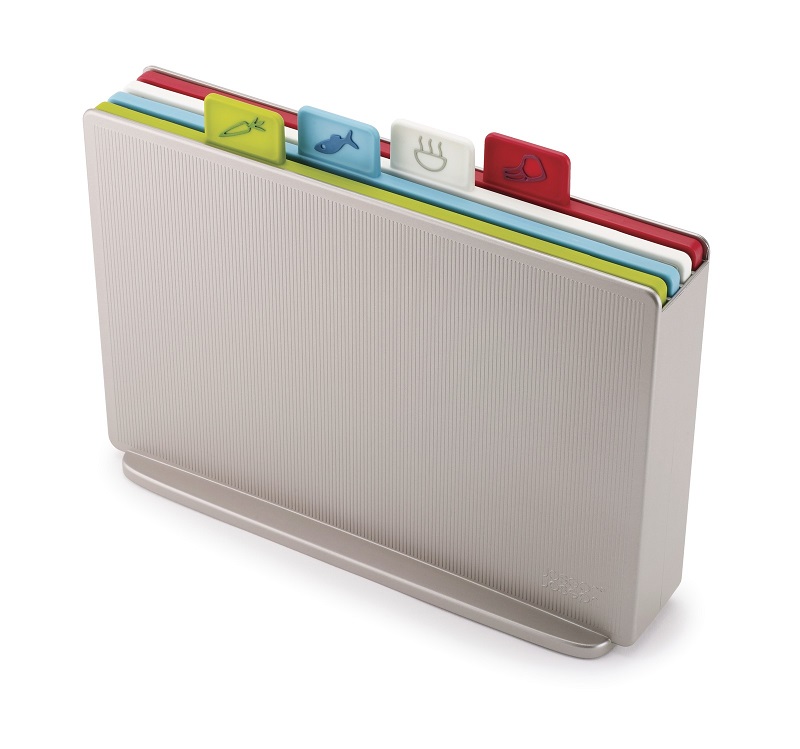Zestaw czterech dużych desek w stojaku z odpornej na odbicia palców stali nierdzewnej. Deski różnią się kolorem oraz fakturą powierzchni, która dostosowana jest do odpowiednich produktów.