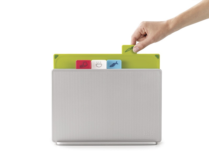 Każda z desek w zestawie posiada antypoślizgowe narożniki, które przytrzymują ją na miejscu w trakcie krojenia. Dodatkowo posiadają one również estetyczne elementu indeksujące z obrazkiem.