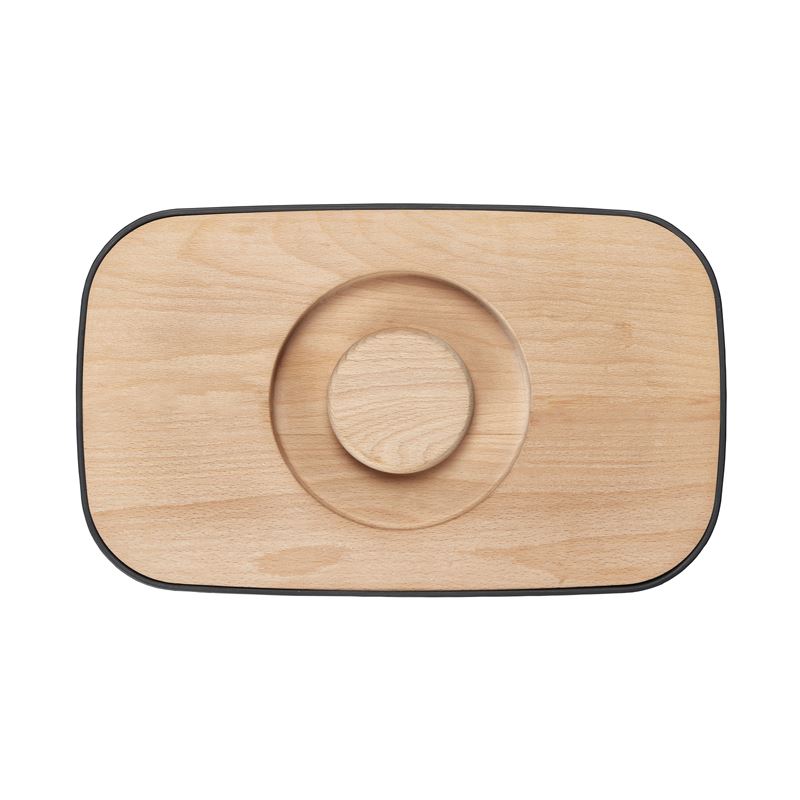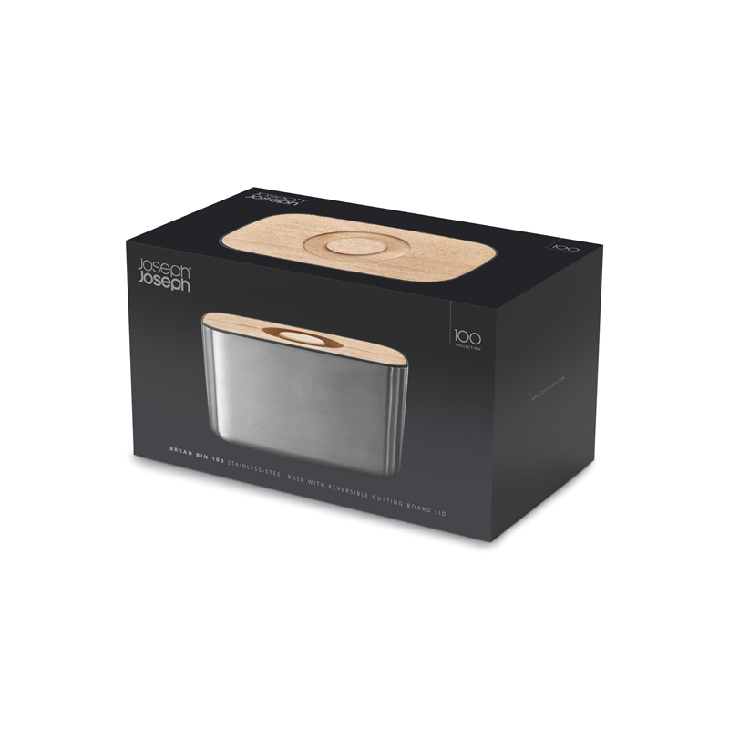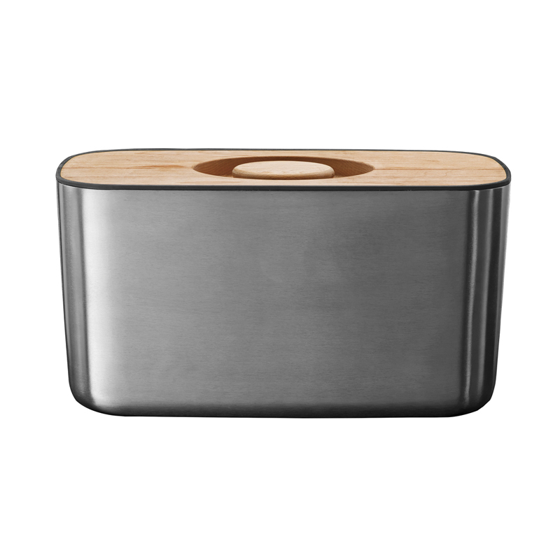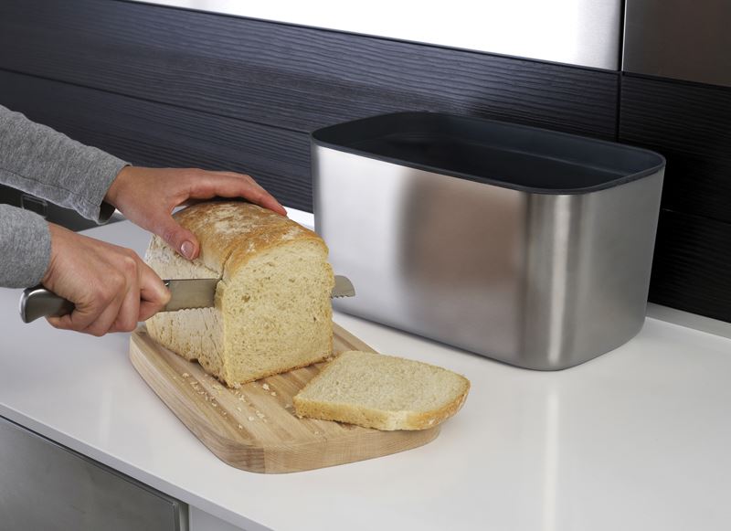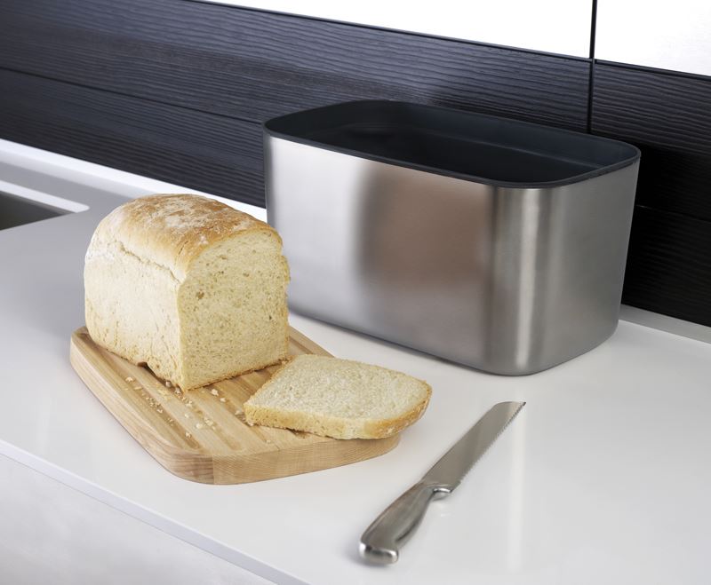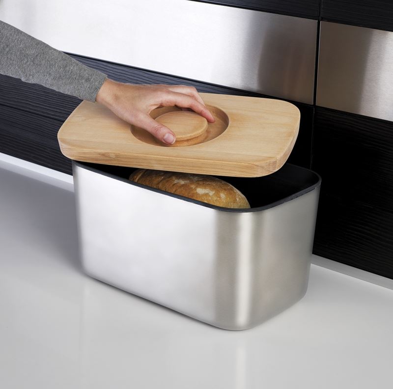 Korpus chlebaka został idealnie dopracowany i wykonany z najwyższej jakości stali nierdzewnej. Posiada antypoślizgowe nóżki, chroniące blaty. Przykrywka chlebaka jest wykonana z drewna bukowego i pełni również funkcję deski do krojenia. Z jednej strony deska jest żłobkowana.