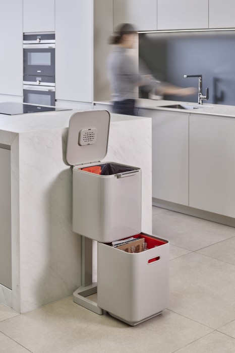 Wykonany ze stali malowanej proszkowo oraz tworzywa sztucznego. W pokrywie znajduje się filtr węglowy zatrzymujący nieprzyjemne zapachy. Dolna część pojemnika jest wysuwana, dzięki czemu jest łatwa do opróżniania. Wyposażony w wyjmowany pojemnik na odpadki organiczne o pojemności 4 l, który możemy postawić na blacie.