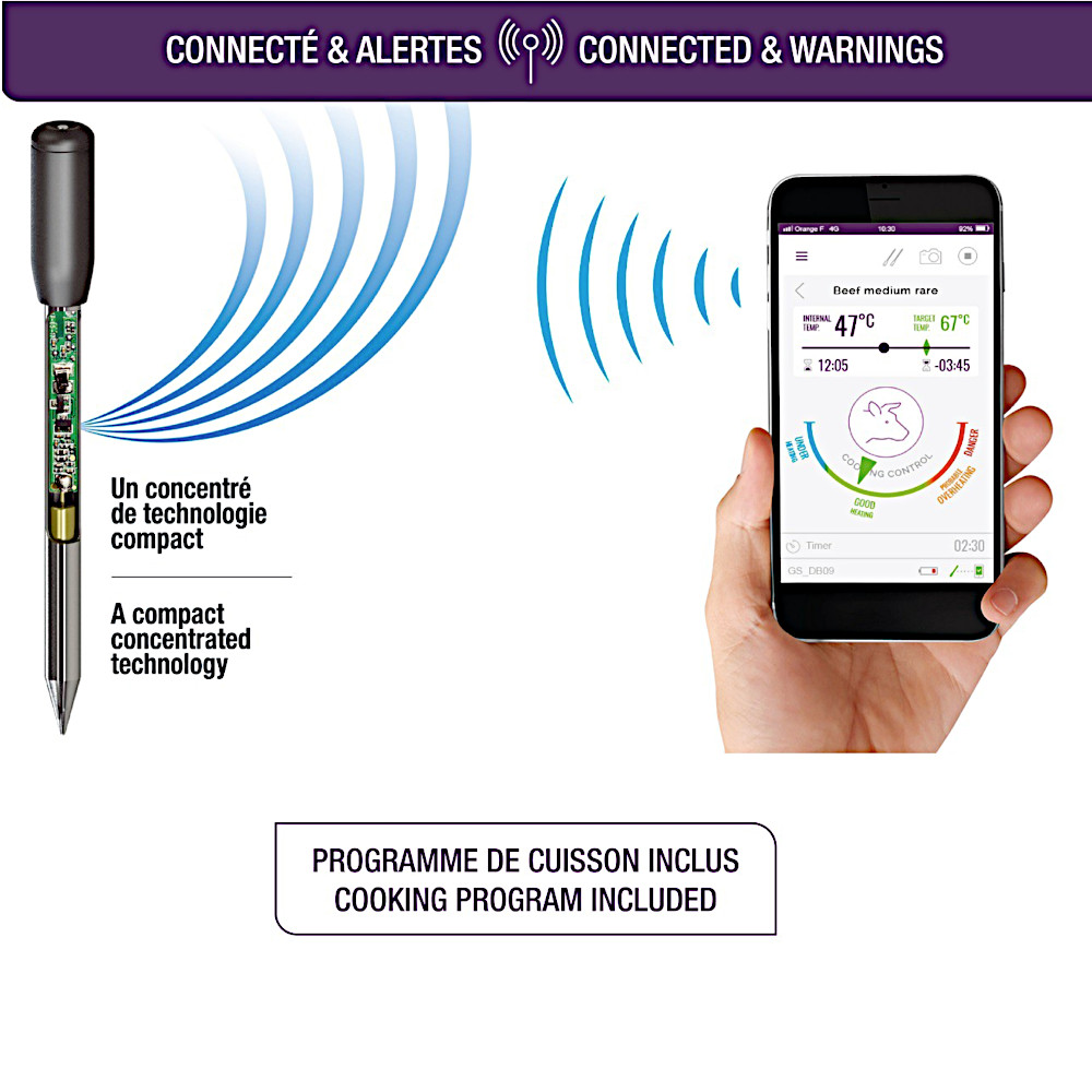 Dzięki tej innowacyjnej w pełni bezprzewodowej sondzie z łatwością kontrolujesz przygotowanie mięsa.