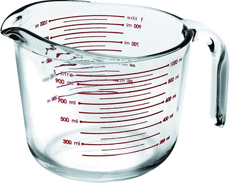 Najniższa cena produktu w ostatnich 30 dniach to cena widniejąca w karcie produktu nad stawką VAT Dzbanek do odmierzania produktów spożywczych, o pojemności 1l. Na ściankach dzbanka narysowana jest skalę wyrażona w mililitrach, uncjach oraz pintach.