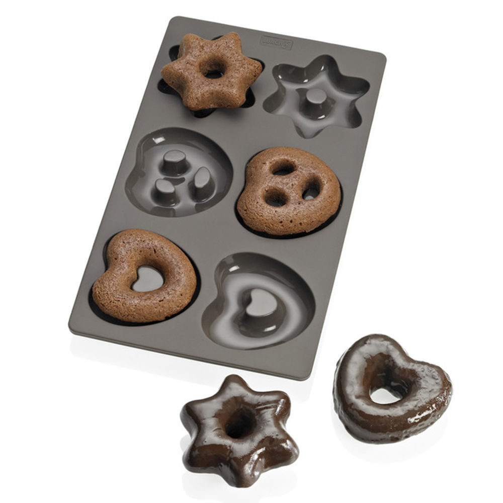 Silikonowa forma, umożliwiająca upieczenie sześciu pierników w klasycznych kształtach: serc, precelków i gwiazdek.