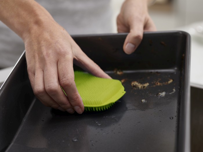 Zestaw do mycia naczyń: szczotka z drapakiem do resztek i dwustronna myjka.