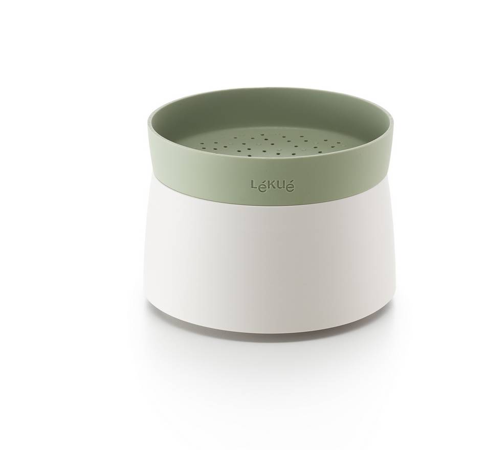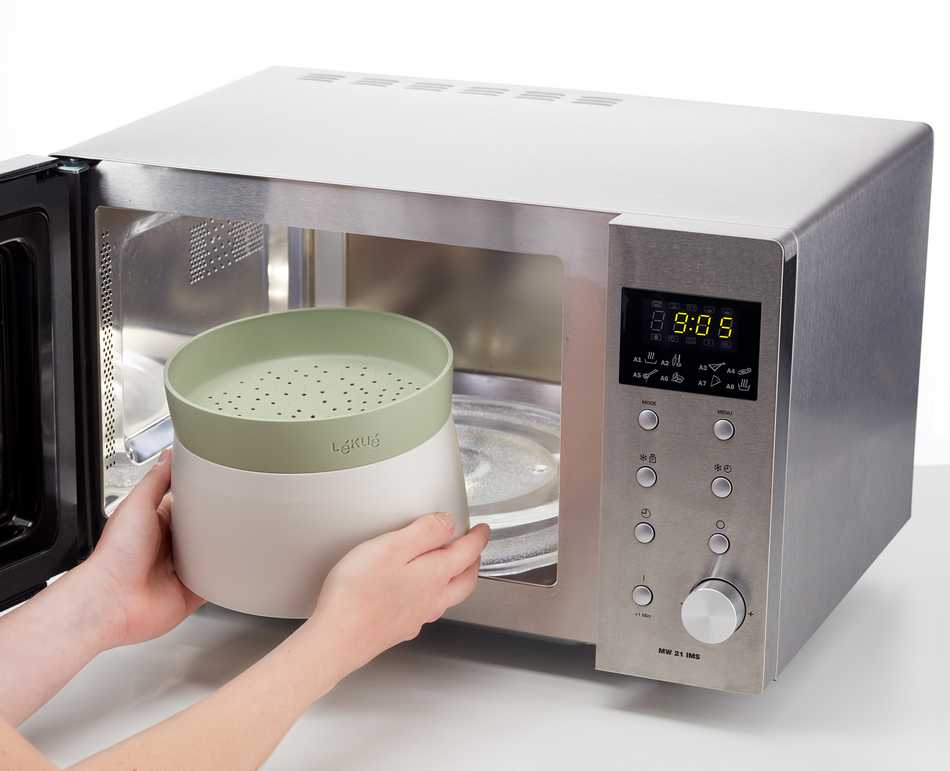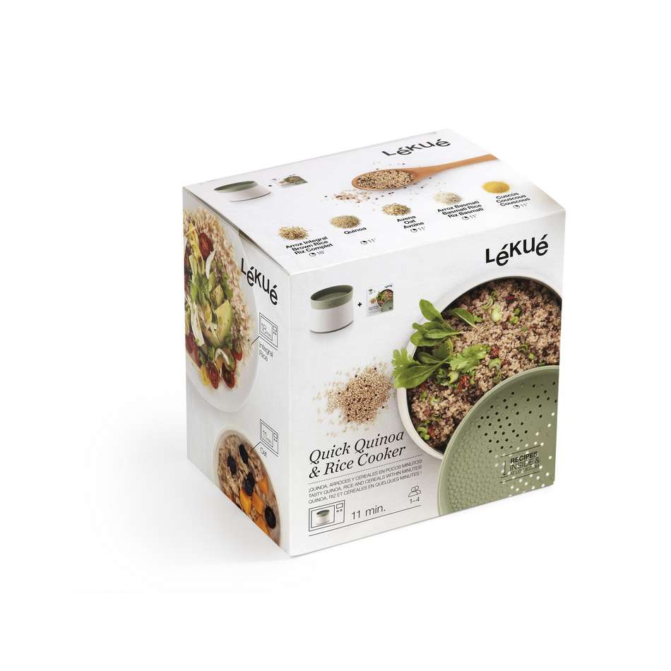 Po umieszczeniu pokrywy na naczyniu, wstawić do kuchenki (moc 800W). Gotować według czasu podanego na opakowaniu produktu i instrukcji Lekue oraz preferencji smakowych. Wyjąć z kuchenki używając rękawicy ochronnej. Przemieszać ziarna i zostawić na 3 minuty, odcedzić resztę wody, zdjąć pokrywę, serwować.