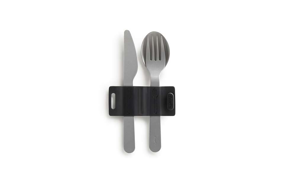 Sztućce wykonane ze stali nierdzewnej połączone są silikonową opaską - dzięki temu łatwiej je transportować i trudniej zgubić.