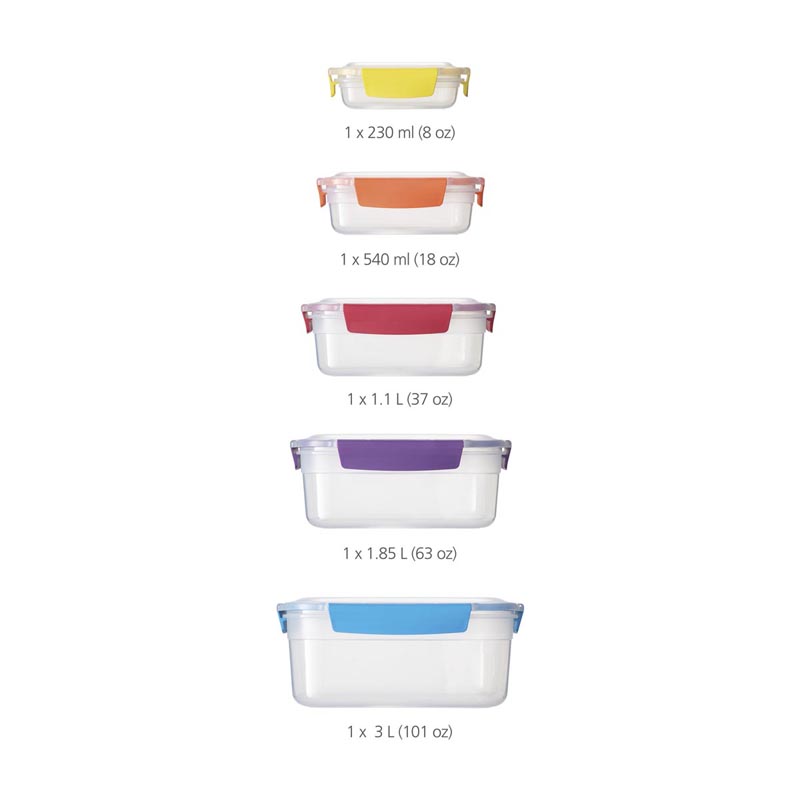 Pojemniki wykonane są z tworzywa sztucznego wolnego od BPA. W komplecie znajduje się pięć pojemników o pojemnościach: 230 ml, 540 ml, 1,1 l, 1,85 l oraz 3 l.