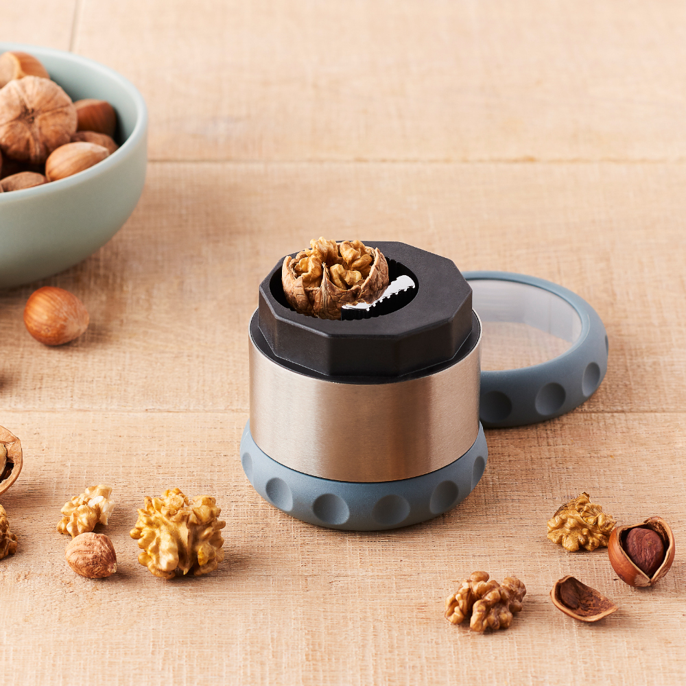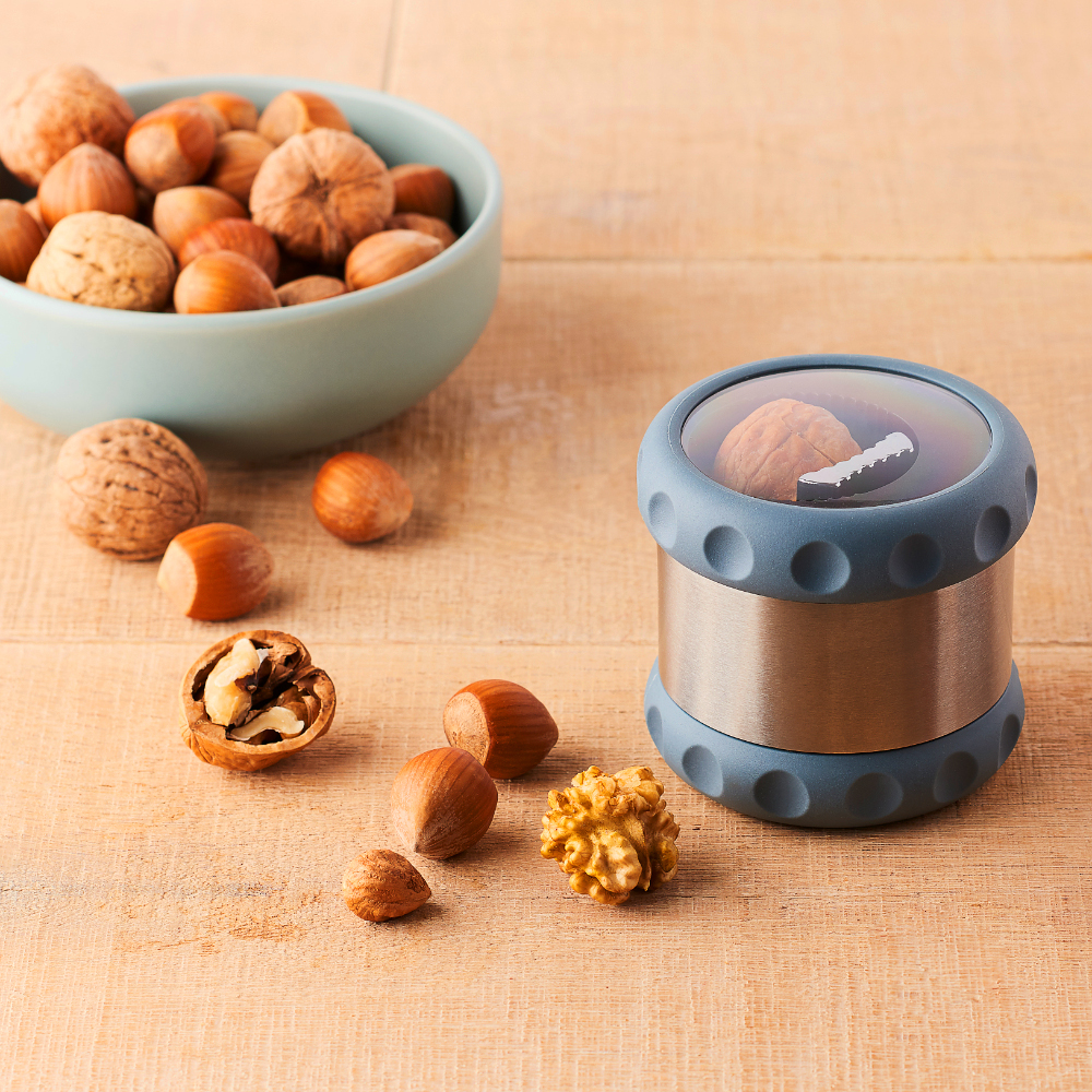 Wkładasz orzech do dziadka zamykasz przeźroczystą pokrywką a drugą ręka delikatnie zaczynasz kręcić spodem. Przeźroczysta pokrywka umożliwia Ci kontrolę nad procesem zgniatania i zatrzymuje łupinki w środku.