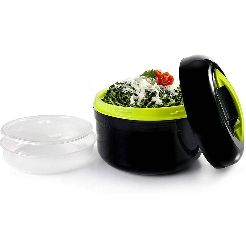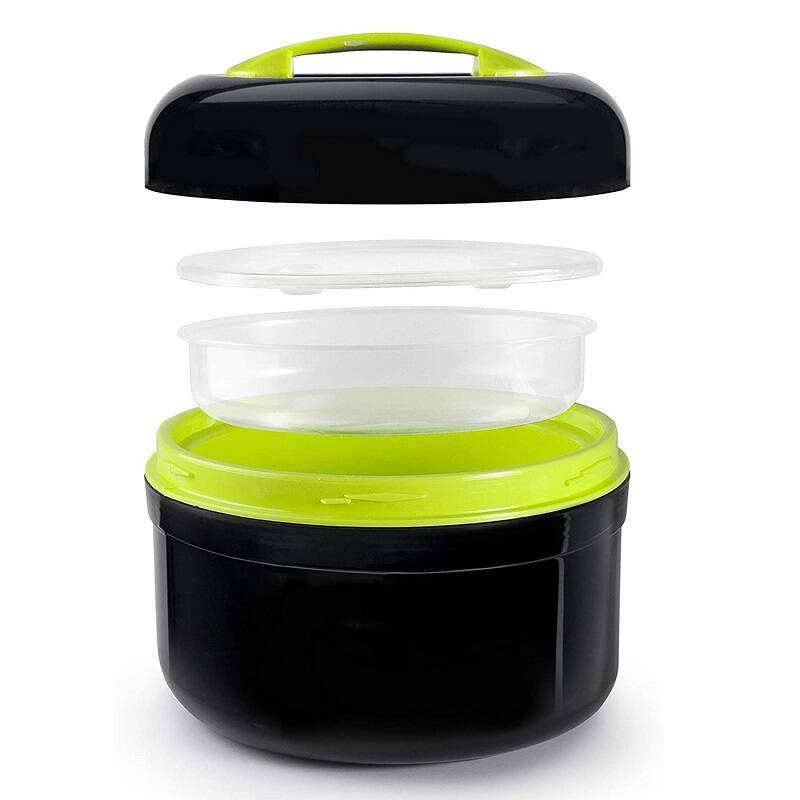 W środku pojemnika znajduje się dodatkowy wkład na żywność, który umożliwia jednoczesne przenoszenie różnych produktów oraz odgrzewanie ich w mikrofali.