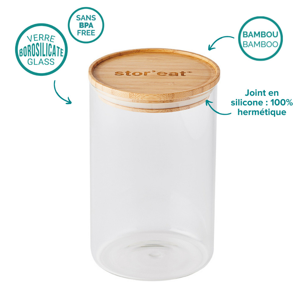 Został wykonany ze szkła borokrzemowego. Szkło jest idealnym materiałem do przechowywania żywności, a szkło borokrzemowe jest cienkie, lekkie i wyjątkowo wytrzymałe. Pokrywka z bambusa z silikonową uszczelką, nie tylko dobrze zabezpiecza zawartość, pełni też funkcję łącznika pomiędzy słoikami. Została zaprojektowana tak, aby można było postawić słoiki jeden na drugim. Jej wysoki na 0,5 cm brzeg zabezpiecza przed przypadkowym ześlizgnięciem się naczynia.