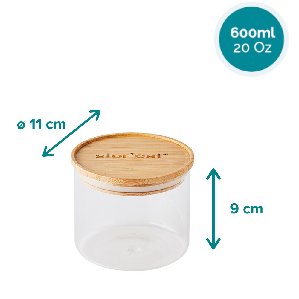 Został wykonany ze szkła borokrzemowego. Szkło jest idealnym materiałem do przechowywania żywności, a szkło borokrzemowe jest cienkie, lekkie i wyjątkowo wytrzymałe. Pokrywka z bambusa z silikonową uszczelką, nie tylko dobrze zabezpiecza zawartość, pełni też funkcję łącznika pomiędzy słoikami. Została zaprojektowana tak, aby można było postawić słoiki jeden na drugim. Jej wysoki na 0,5 cm brzeg zabezpiecza przed przypadkowym ześlizgnięciem się naczynia.