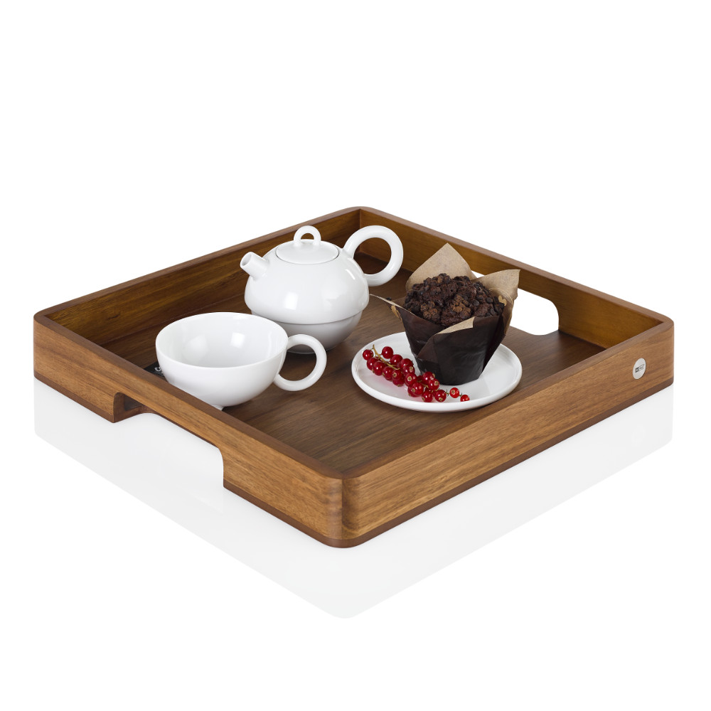 Praktyczna, a jednocześnie elegancka taca do serwowania z łatwością pomieści dwa talerze o średnicy 28 cm. Wykonana jest z drewna akacji i orzechu dzięki czemu ma wygląd naturalnego drewna.