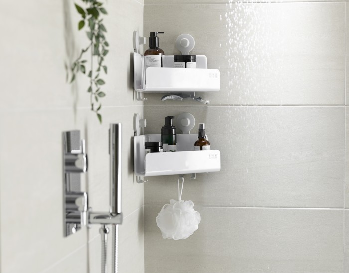 Zestaw dwóch narożnych organizerów pod prysznic. Montowane za pomocą przyssawki - bez konieczności wiercenia dziur. Zdejmowane - można zsunąć je ze stelaży.