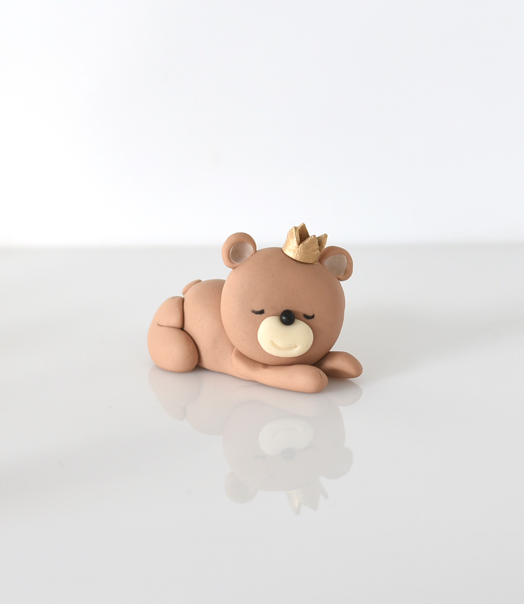 Figurka z masy cukrowej miś leżący. Idealna podczas przygotowania spotkań takich jak babyshower, pierwsze urodziny, chrzciny i wiele innych. Można udekorować nią tort, babeczki, ciasteczka. Figurka, ozdobna z produktów jadalnych, nie nadaje się do spożycia, ze względu na to, że może zawierać niejadalne elementy, np wykałaczki, druciki, styropian itp.